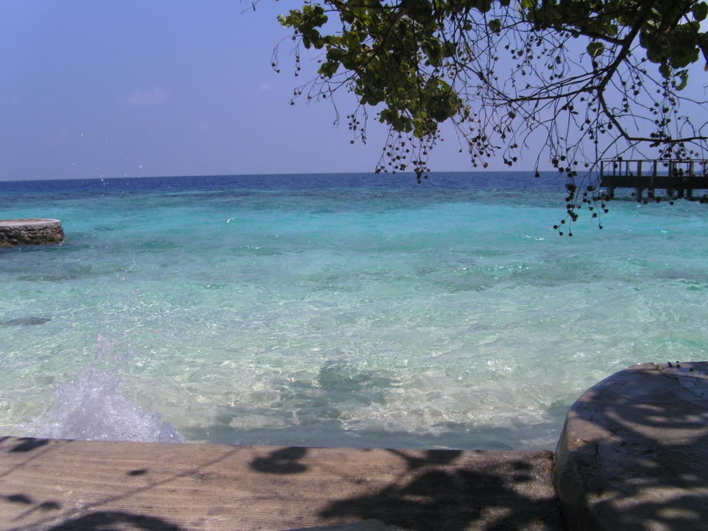 Südostseite mit Blick auf das Riff und die Aqua Bar. Ein angenehmer Schattenplatz , jedoch ohne Strand mit Schutzmauer und Stufen.