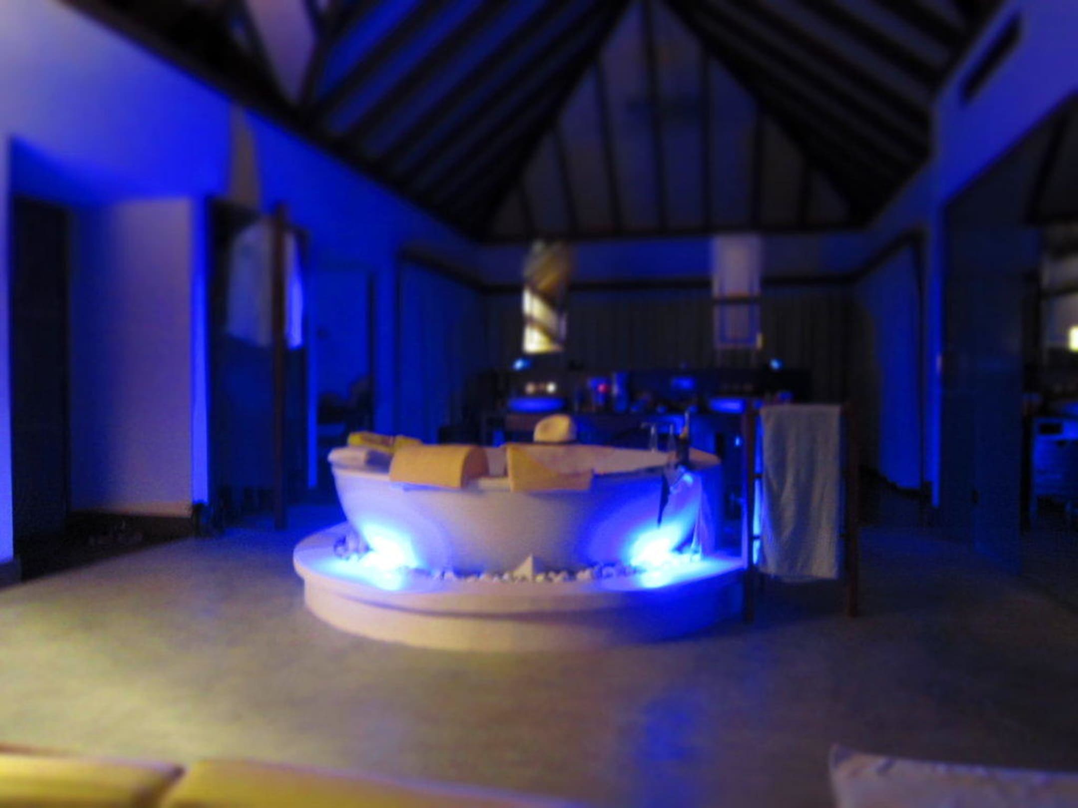 ZimmerDas große runde Bad, in dem zwei Personen locker baden können mit LED AUßenbeleuchtung. Modern.