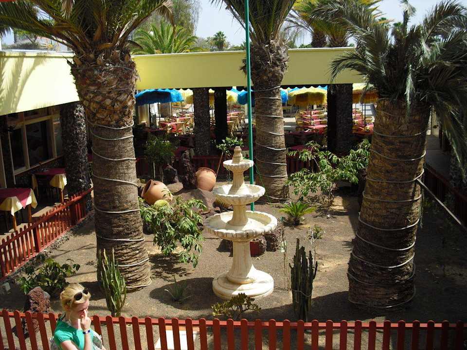 Garten und dahinter das Restaurant + Terasse