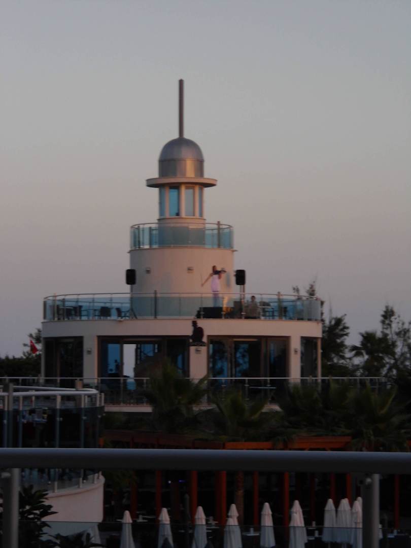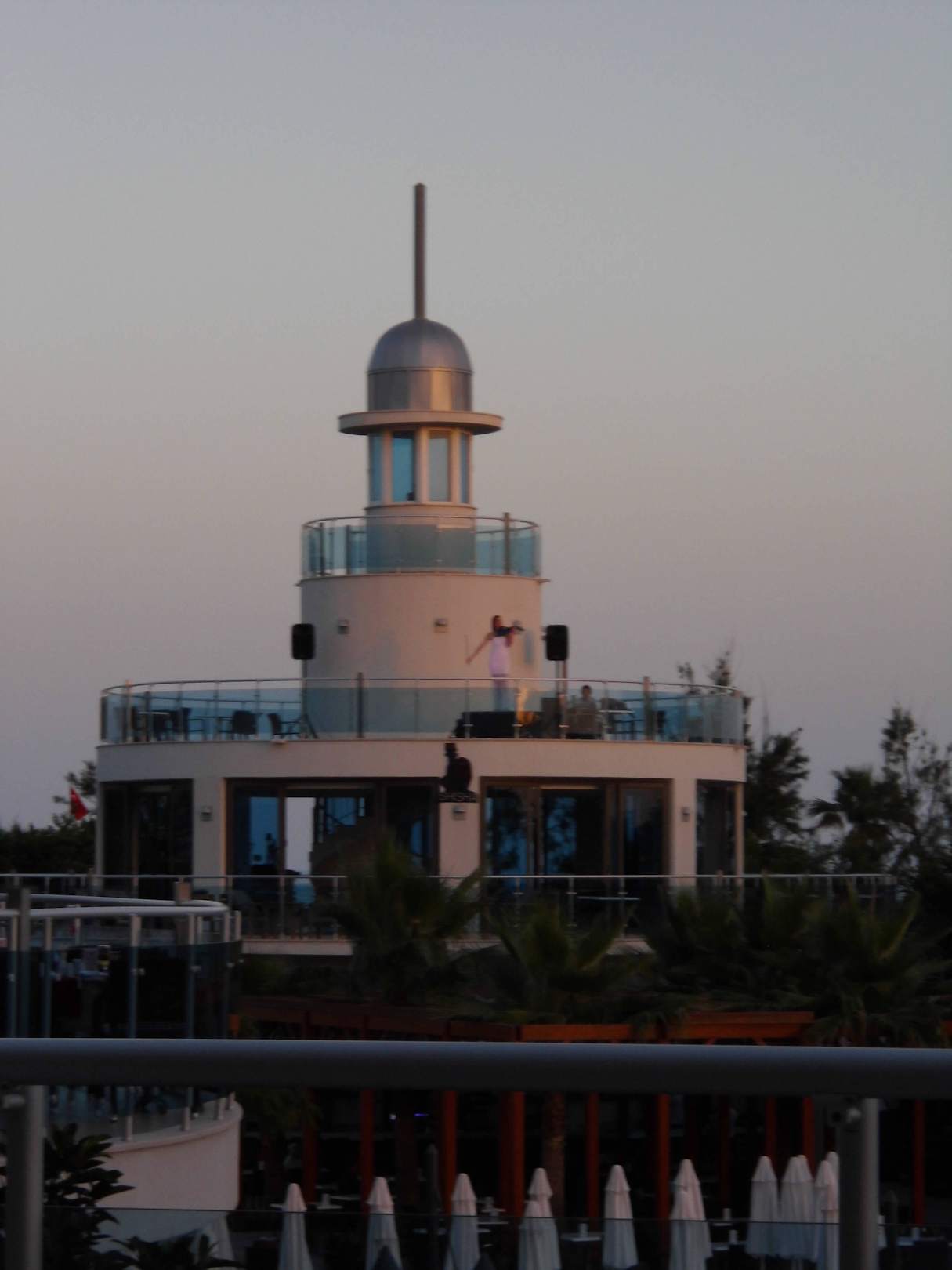 Zufällig zu meinem Geburtstag, auf der Terrasse des Gusto sitzend, spielte eine junge Dame auf dem Leuchtturm Musik mit einer E-Geige. Durch angeschlossene Verstärker konnte es die ganze Anlage hören. Toll.