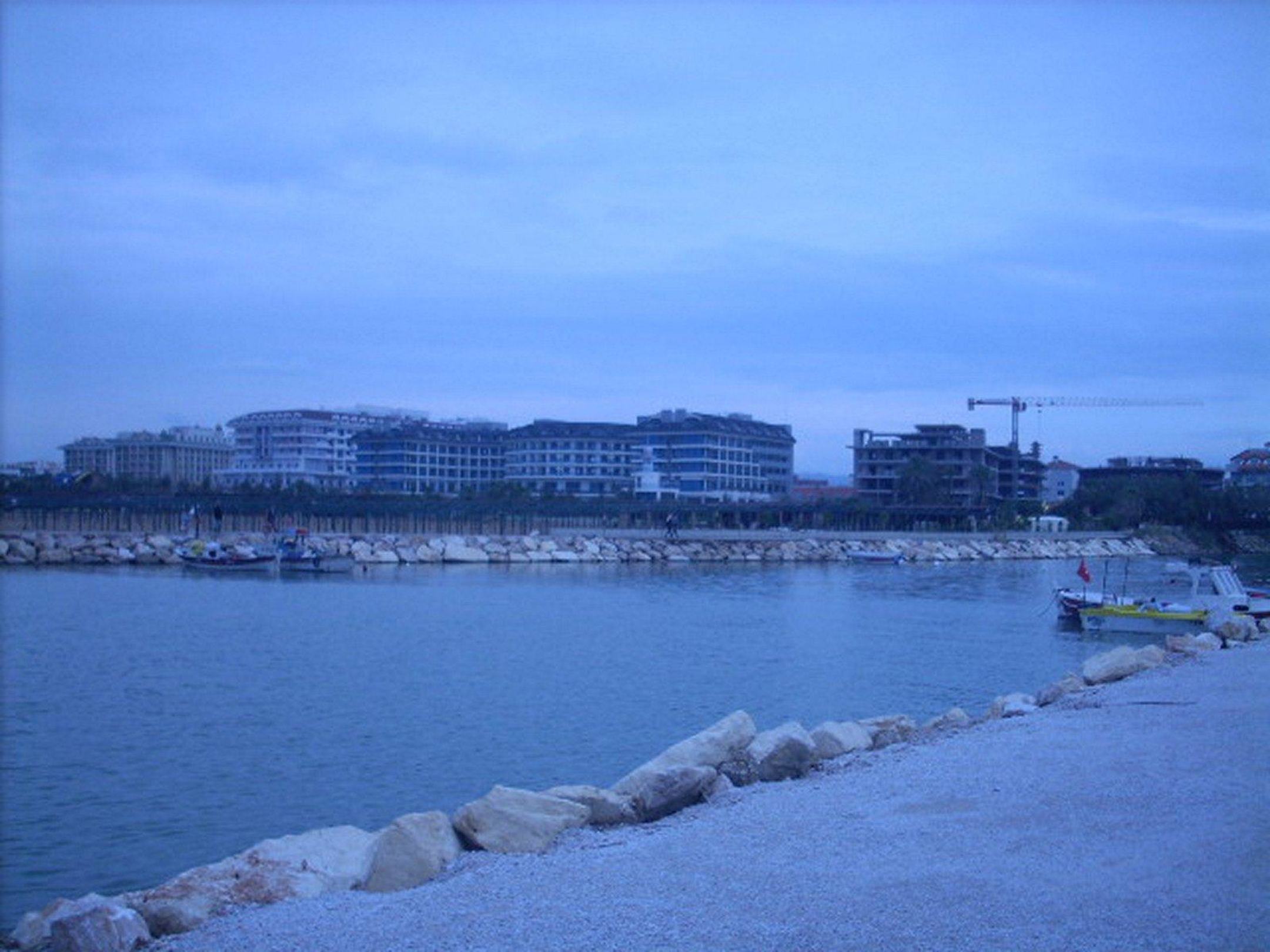 Blick vom Hafen auf das Hotel und die Baustellen