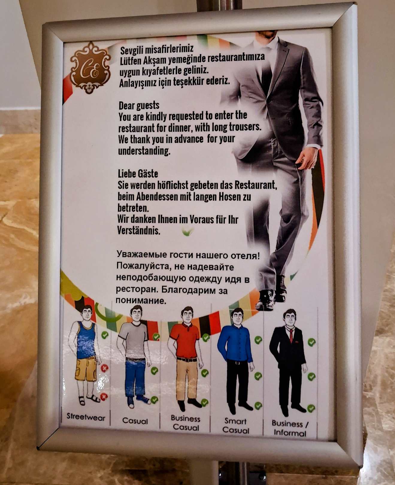 Hinweiß zur Abendgarderobe für das Restaurant.