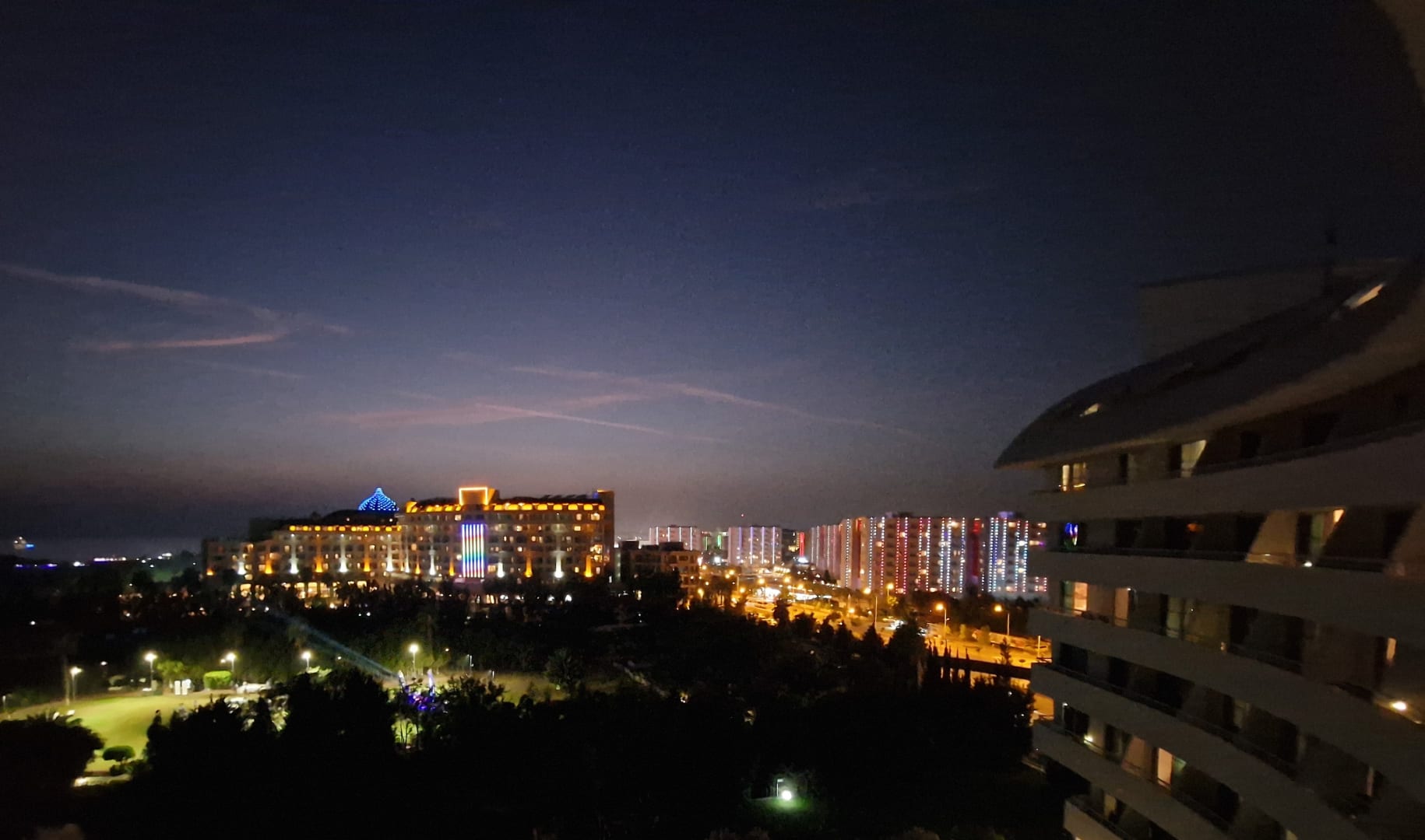 Blick vom Balkon auf das Hotel "Fame Residenz", den eigenen Gartenbereich und im Hintergrund links das Meer. Rechts ist die vierspurige Straße zu sehen, von der auch in der Nacht eine gewisse Geräuschkulisse ausging.