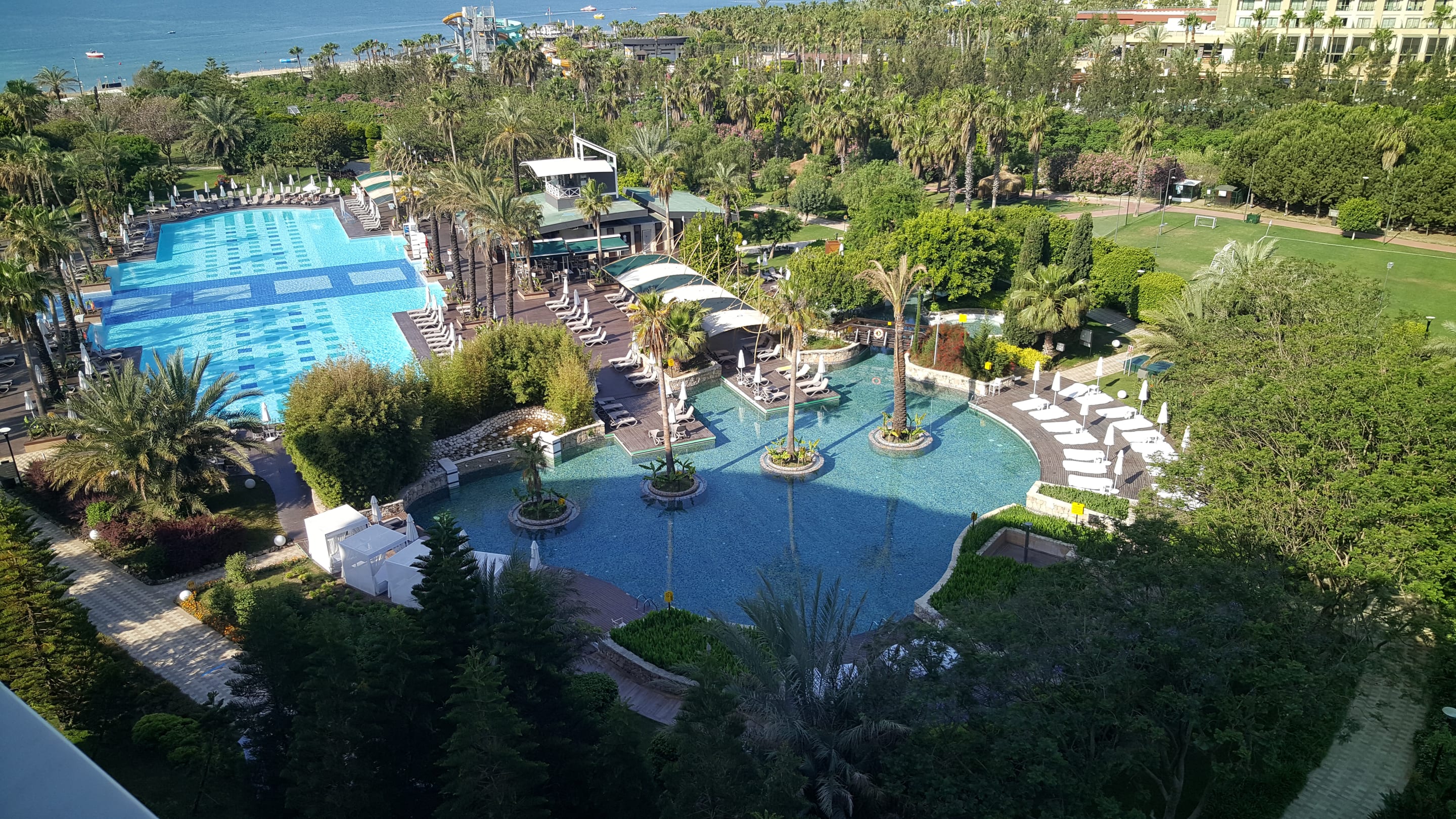 Haupt- und Relaxpool direkt nebeneinander. Rechts vom Hauptpool die Poolbar
