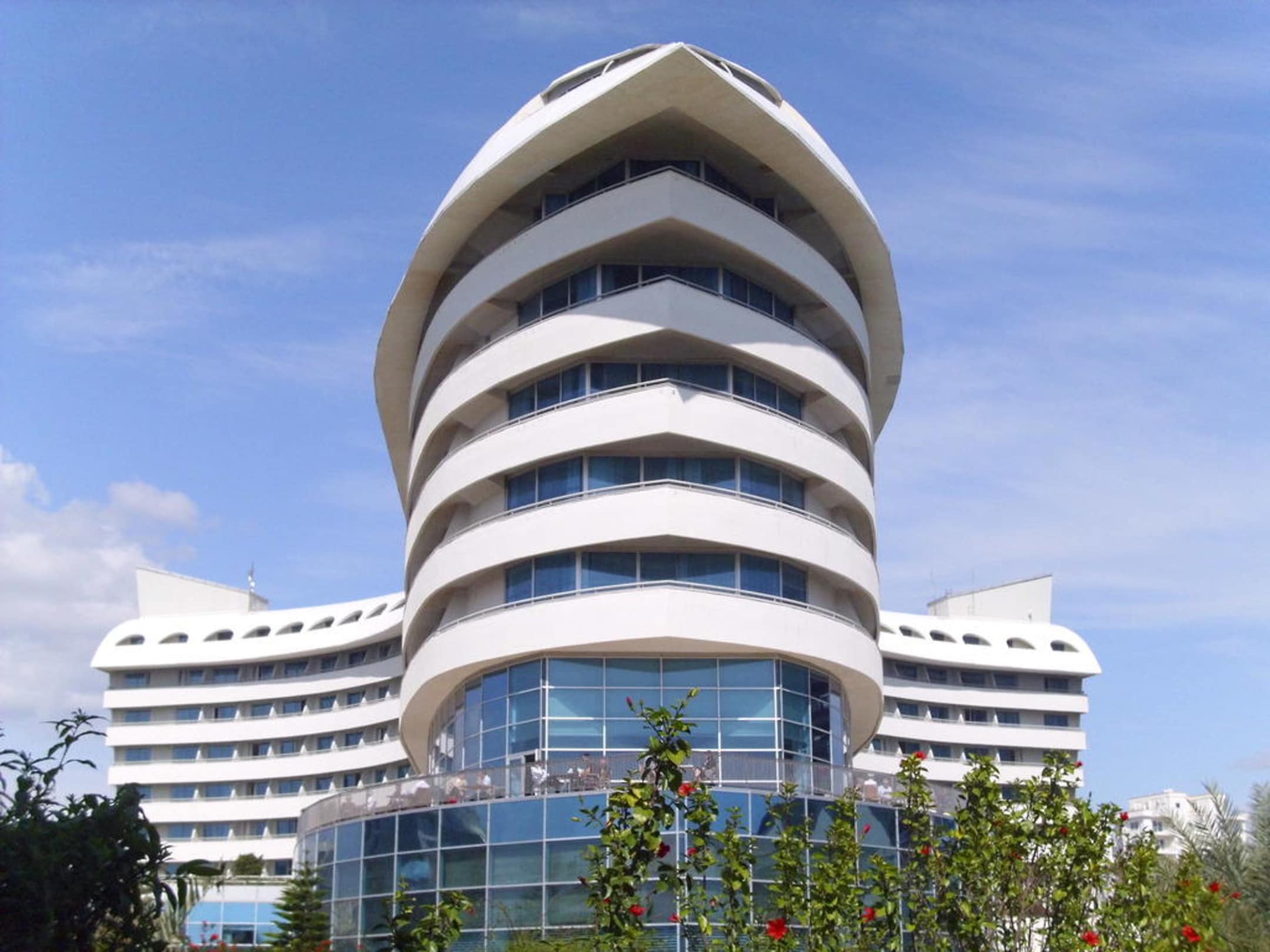 Die ungewöhnliche Perspektive bringt den Grundriss und die Form des Hotels zur Geltung. Hier ist die "Nase" gen Himmel gestreckt und die 7 Stockwerke tanken Sonne.