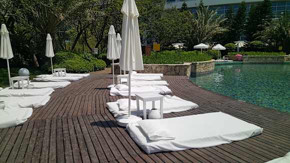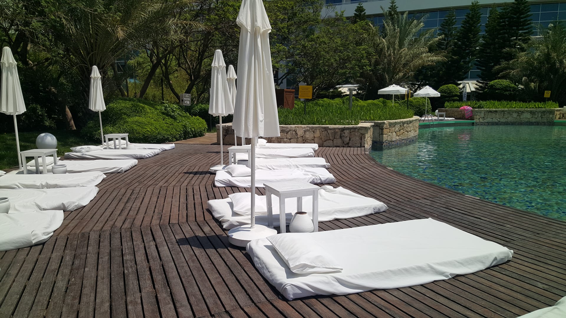 Relaxpool mit Matratzen, aber wenig Schatten.