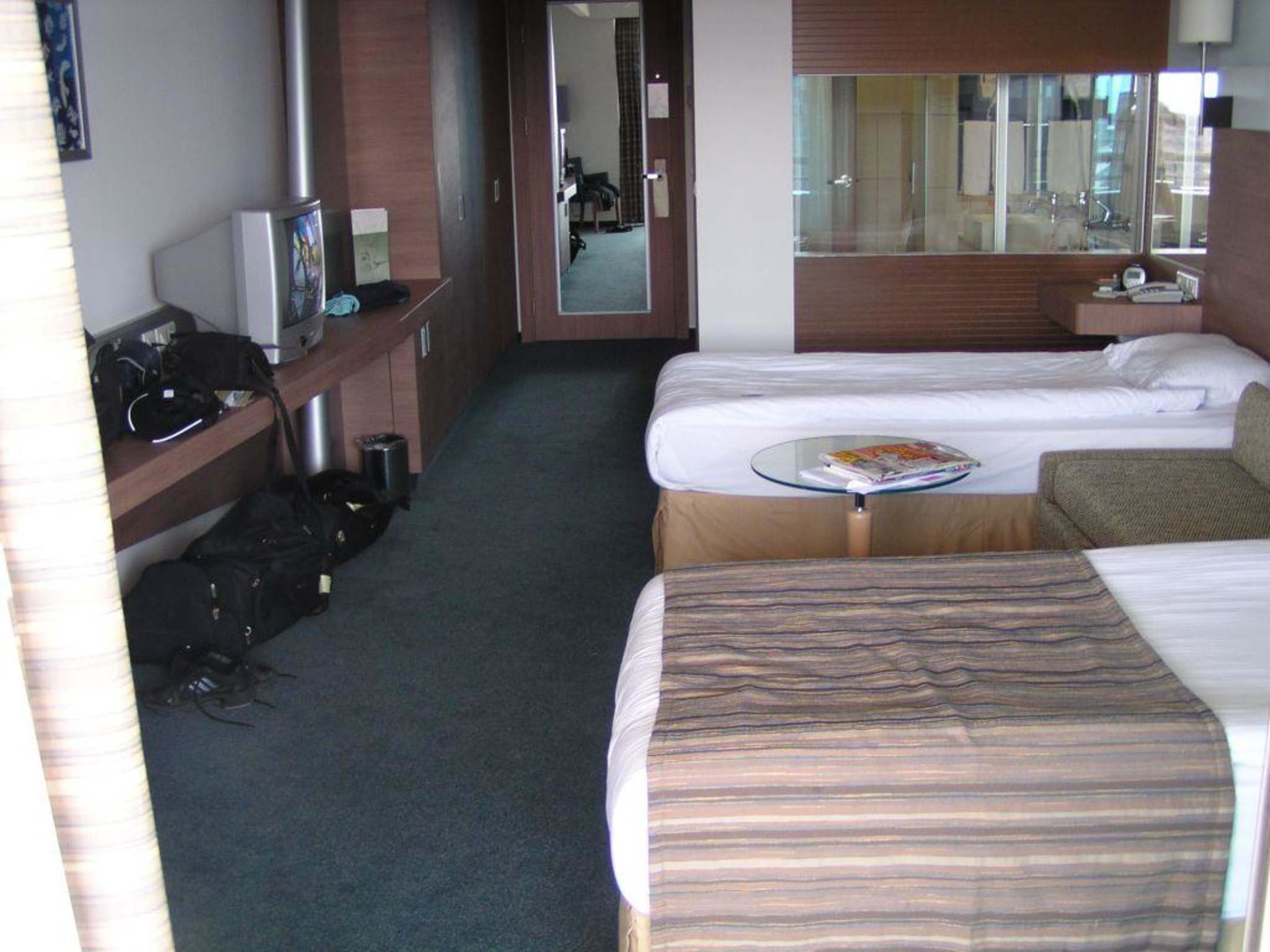Zimmeransicht. Hinter der Glasscheibe befindet sich Bad und Toilette.