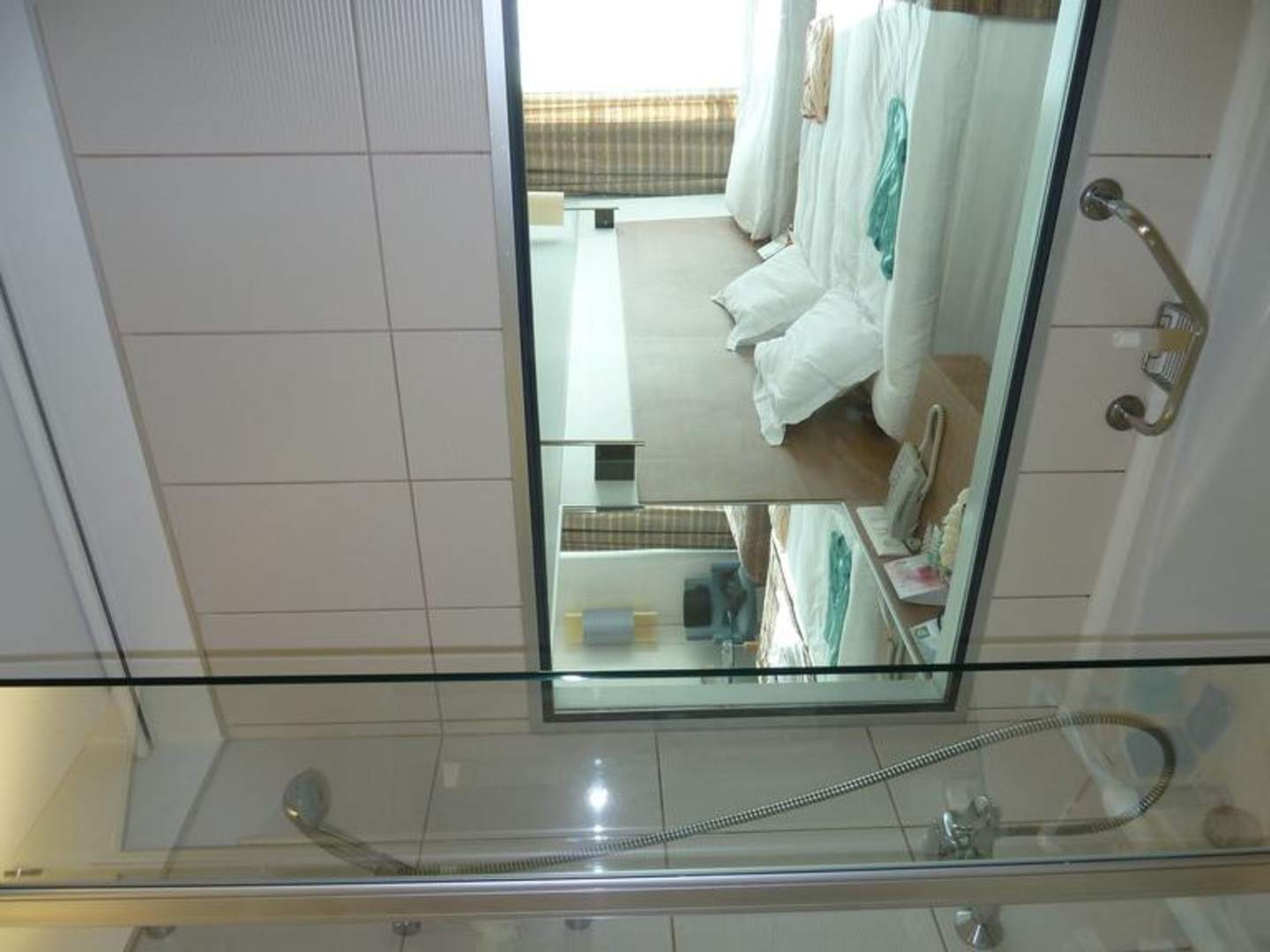Absolut genial die Idee mit der Badlösung: Von der Dusche/ Badewanne gibt ein Fenster den Blick ins Zimmer frei. Bei Bedarf kann die Sicht durch einen Vorhang verhängt werden.