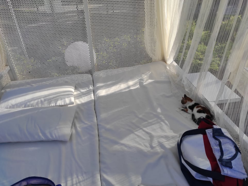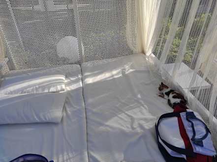 Ein Kätzchen hat es sich im Pavillon gemütlich gemacht.