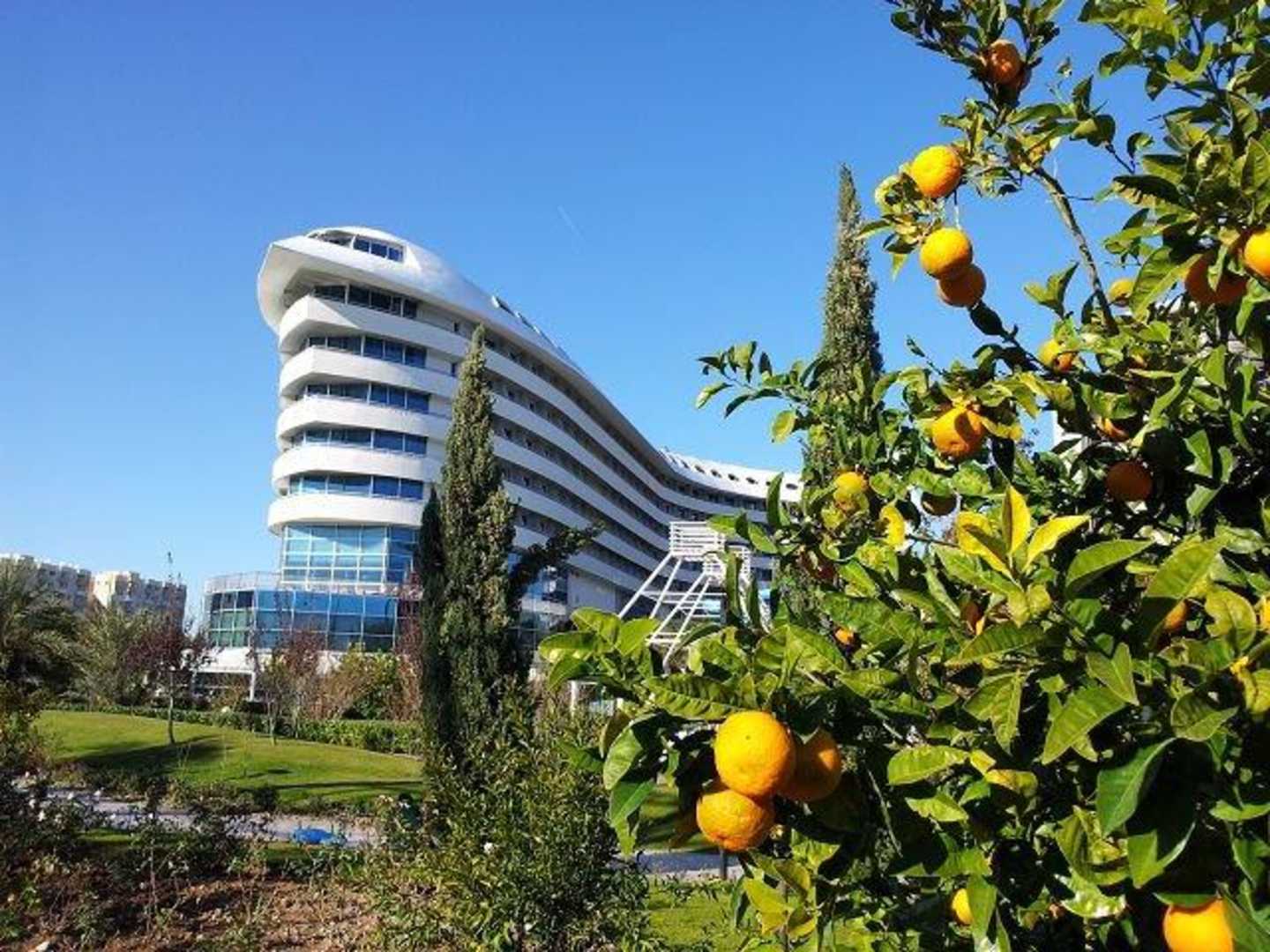 Hotelansicht vom aussen neben Orangenbaum