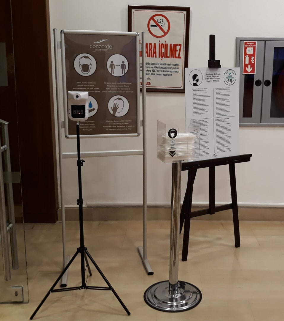Temperaturmessung und Masken mit Anleitung vor dem Restaurant
