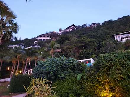 Blick vom Strand auf die Villen am Hang