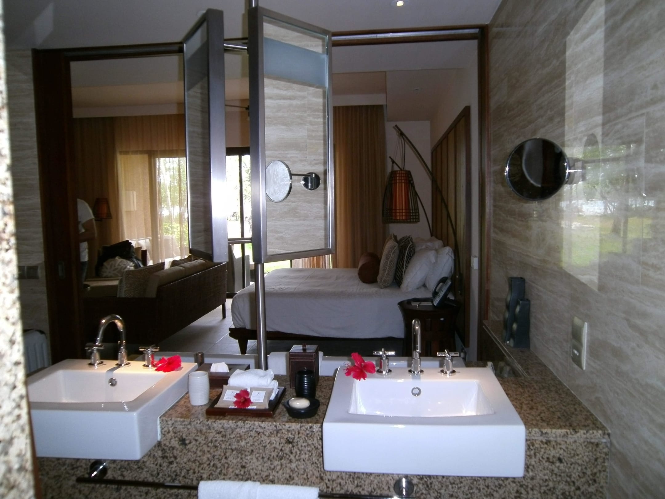 Blick vom Bad aufs Bett und dahinter Terrasse