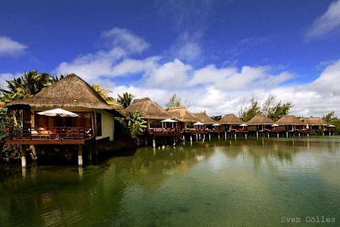 zu sehen sind die Villa auf Pfählen die direkt über eine Bucht im Indischen Ozean gebaut sind. Es gibt noch drei weitere in zweiter Reihe dahinter.