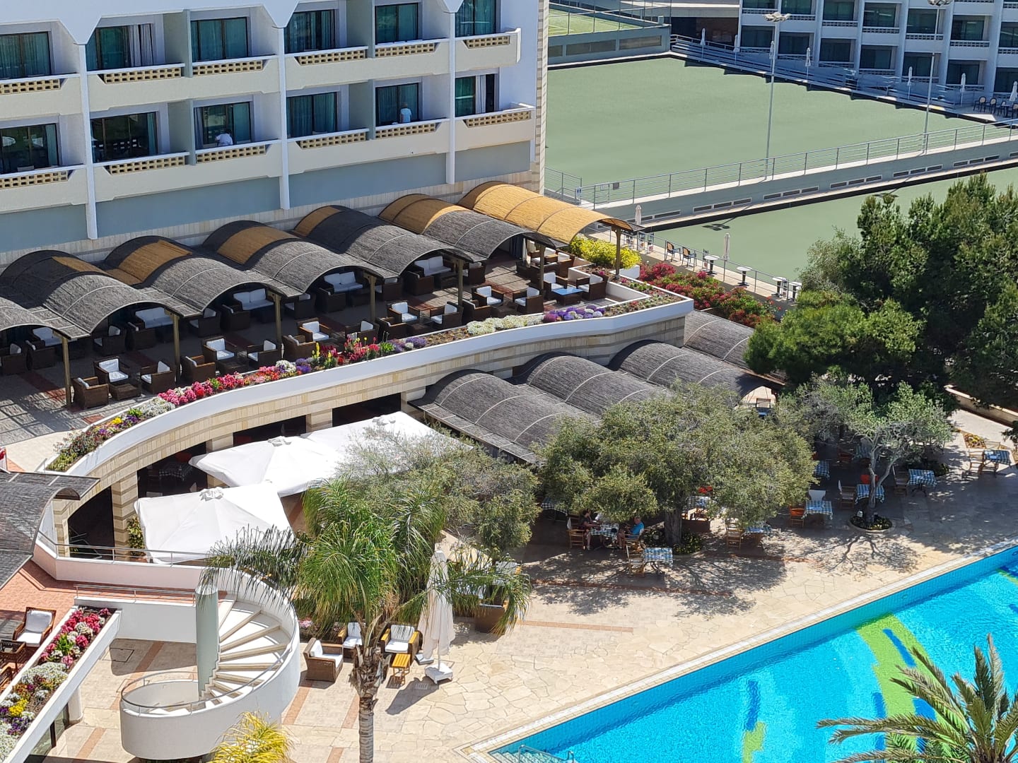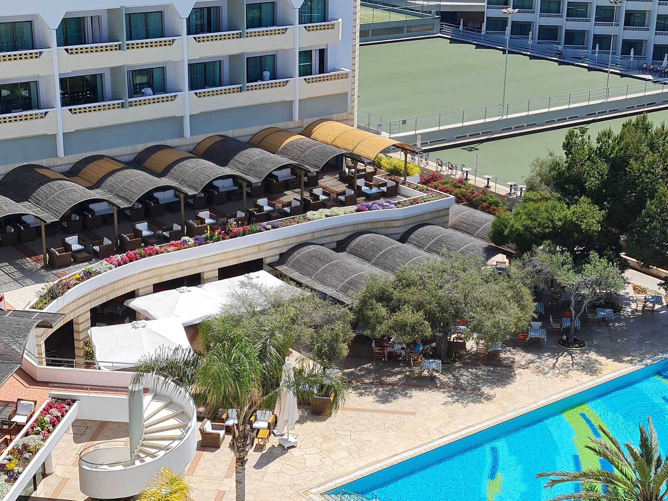 Oben Terrasse der Bar, darunter das Olivenbaum Restaurant am Pool