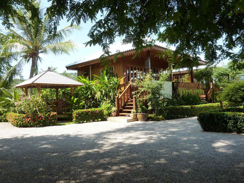 Der Garten mit den Bungalows und dem Pavillion