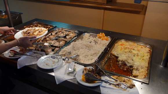 Abendbuffet mit Fisch, Reis, Bolognese und Gulasch