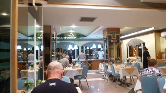 Das Restaurant mit seinen hellblauen Stühlen.
