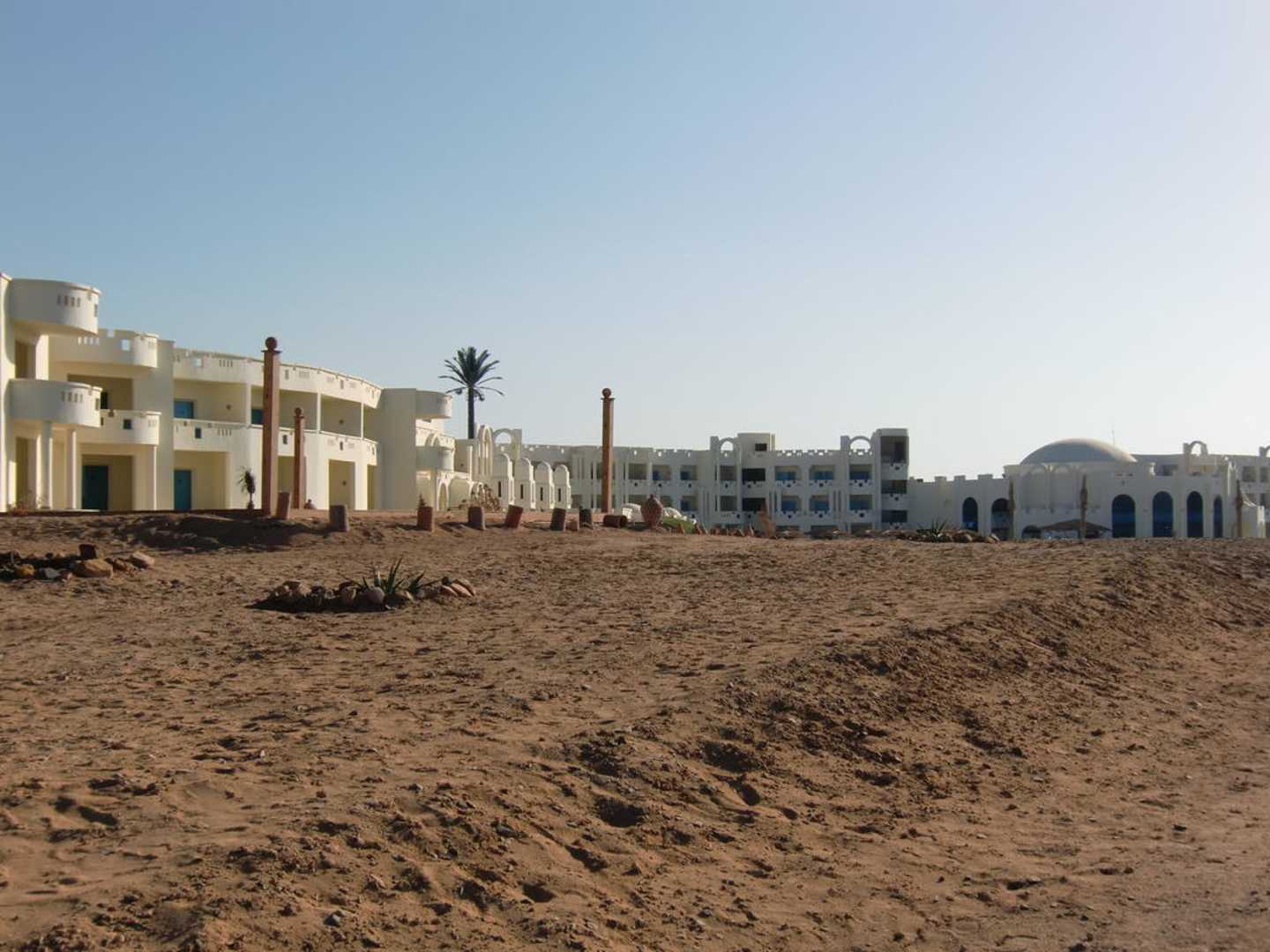 Überall noch Sand, kleinere grüne Stellen werden bewässert und angelegt. Noch ausbaufähig.