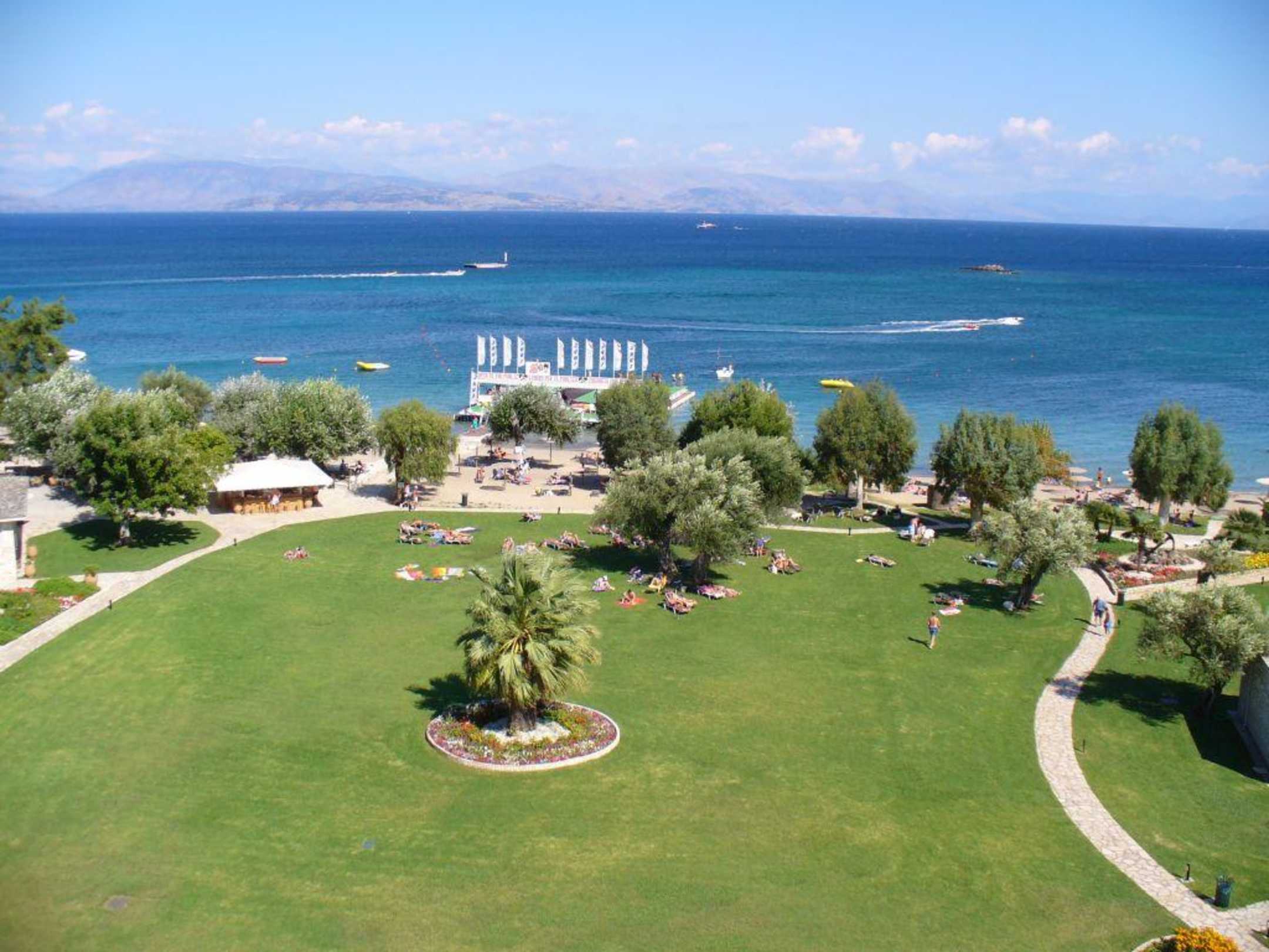 Corfu-Chandris_Blick nach Osten_5te Etage.Blick aus Zimmer 520 auf die Gartenanlage. Links ist noch gaanz wenig vom Grillrestaurant zu sehen. Voraus ein örtlicher und öffentlicher Wassersportanbieter. Sonnenaufgang direkt hinter der Bergkette: Albanien!