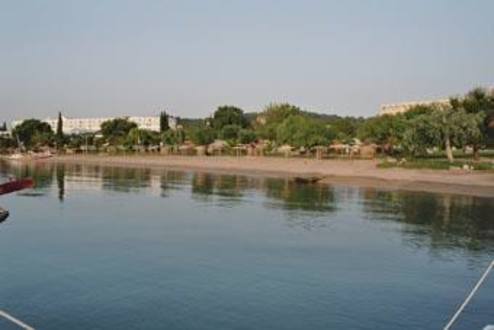 Von einem Steg im Meer aus sieht man die wunderschöne große Gartenanlage mitsamt Strand. Rechts ist das Corfu Chandris und links das Dassia Chandris