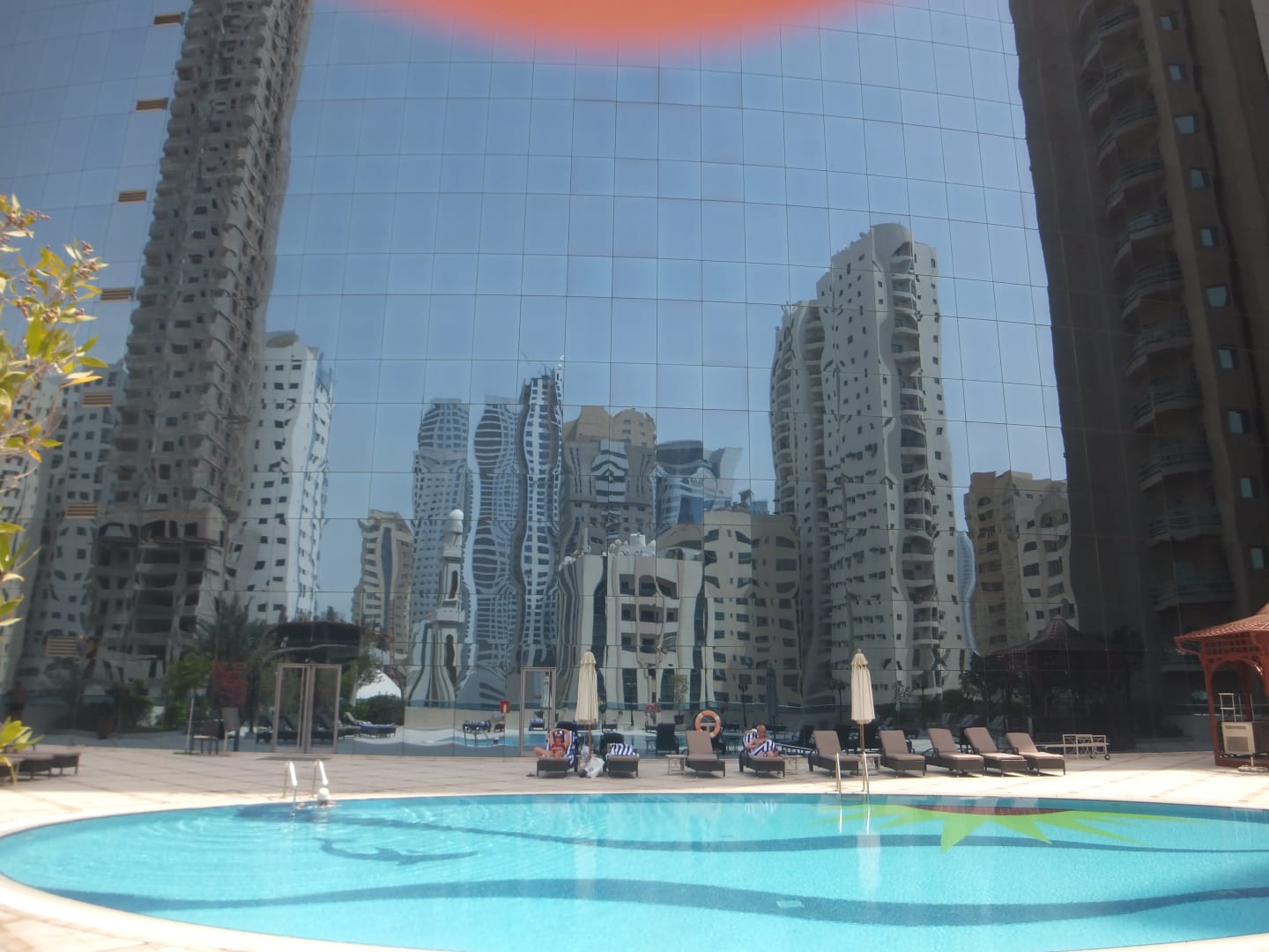 AußenansichtAufgenommen vom Liegestuhl am Pool. Die Skyline spiegelt sich in der Hotelfront.