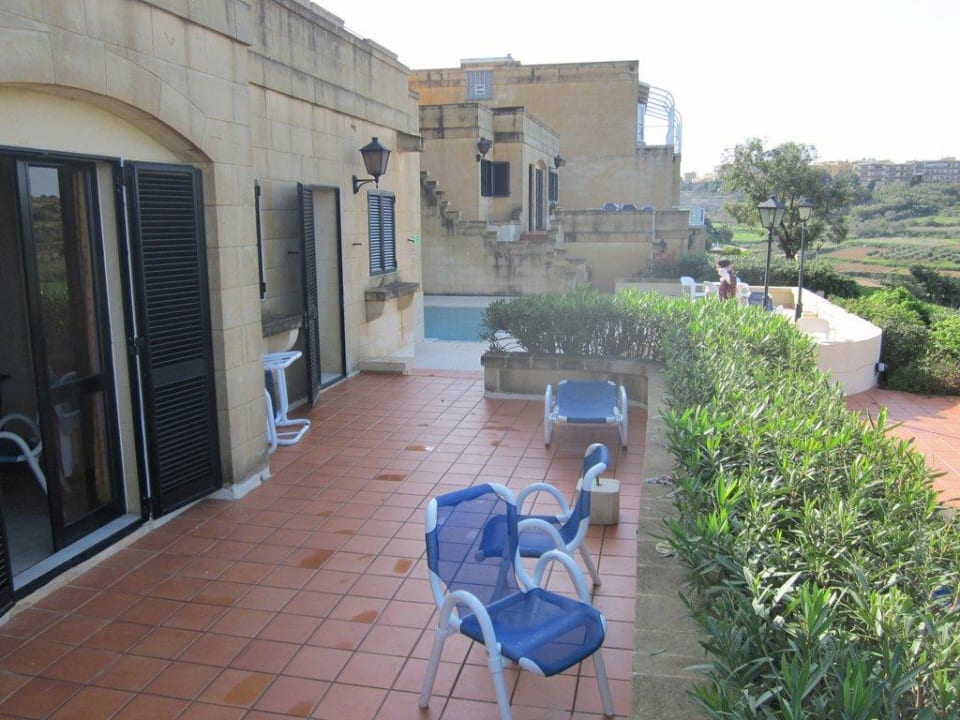 Terrasse mit Blick zum Pool und Nachbar-Bungalow