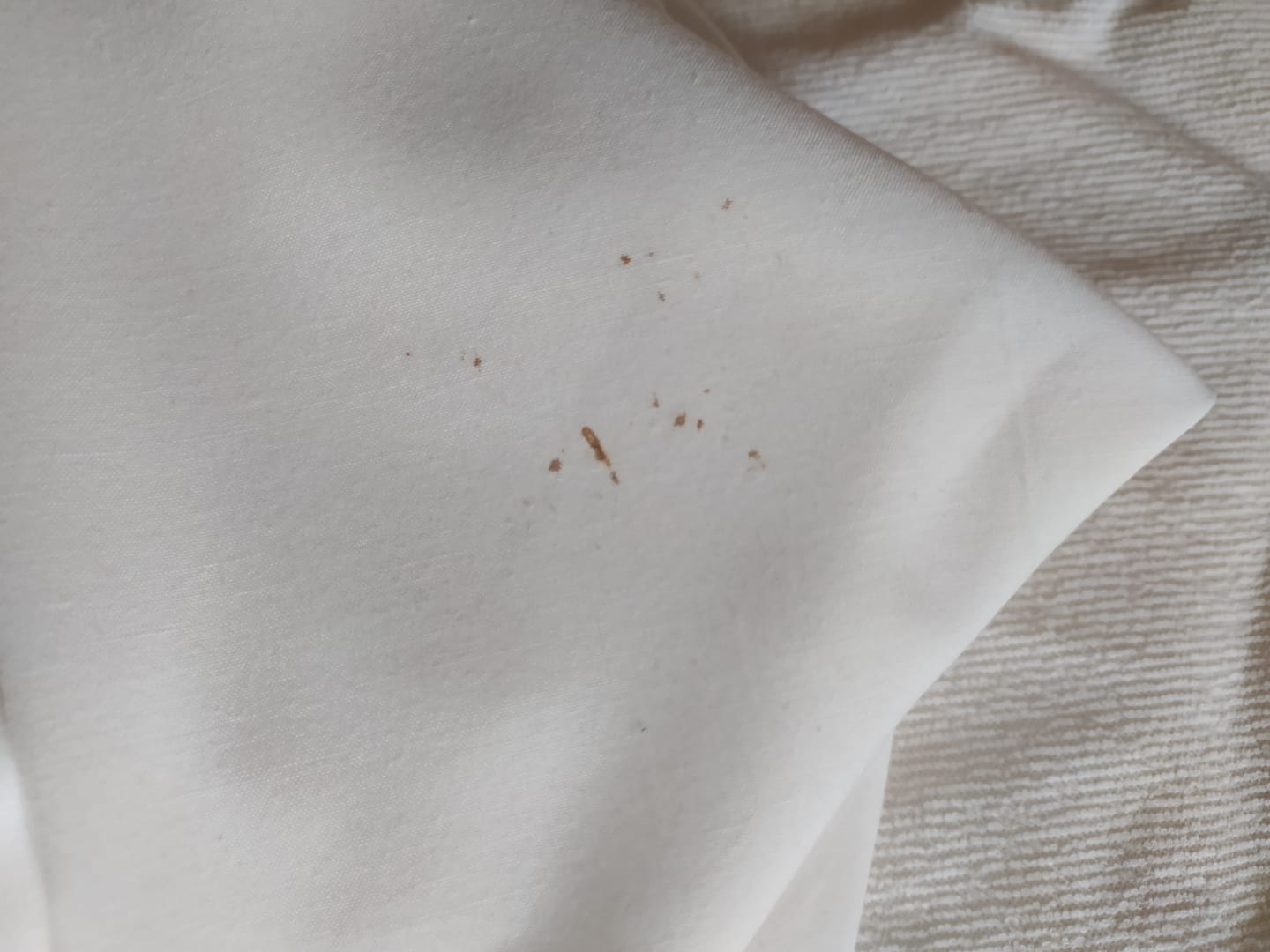 Zweimal in der Woche gab es herrlich frische Bettwäsche... Hier Flecke in der Mitte des Lakens...