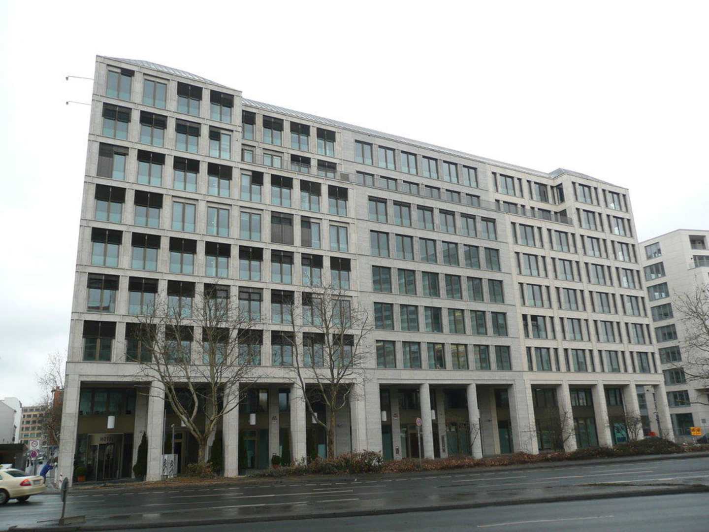 Blick auf die Gebäudefront (von der gegenüberliegenden Straßenseite aus geshen); das Hotel nimmt nur das linke Drittel des (gleichförmigen) Komplexes ein