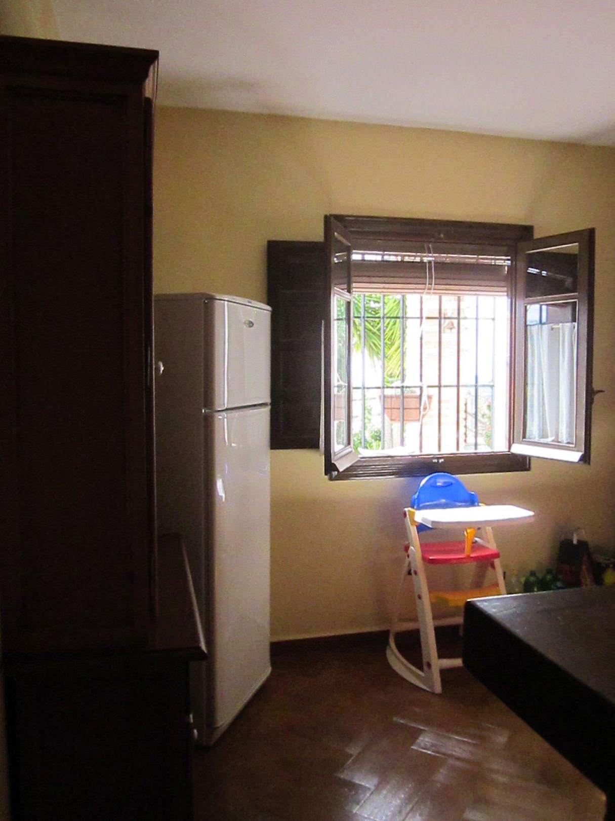 Großer Kühlschrank mit Gefrierfach, rechts Kinderhochstuhl.