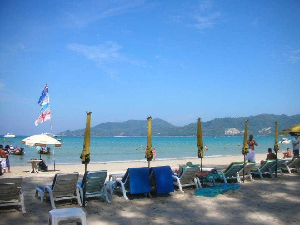zeigt den gleichen Strand genau vis a vis des Patong Merlin Hotels an einem glass klaren Tag ohne Luftfeuchtigkeit, aber gefährlich heiss, weil die Sonne vom Himmel knallt.