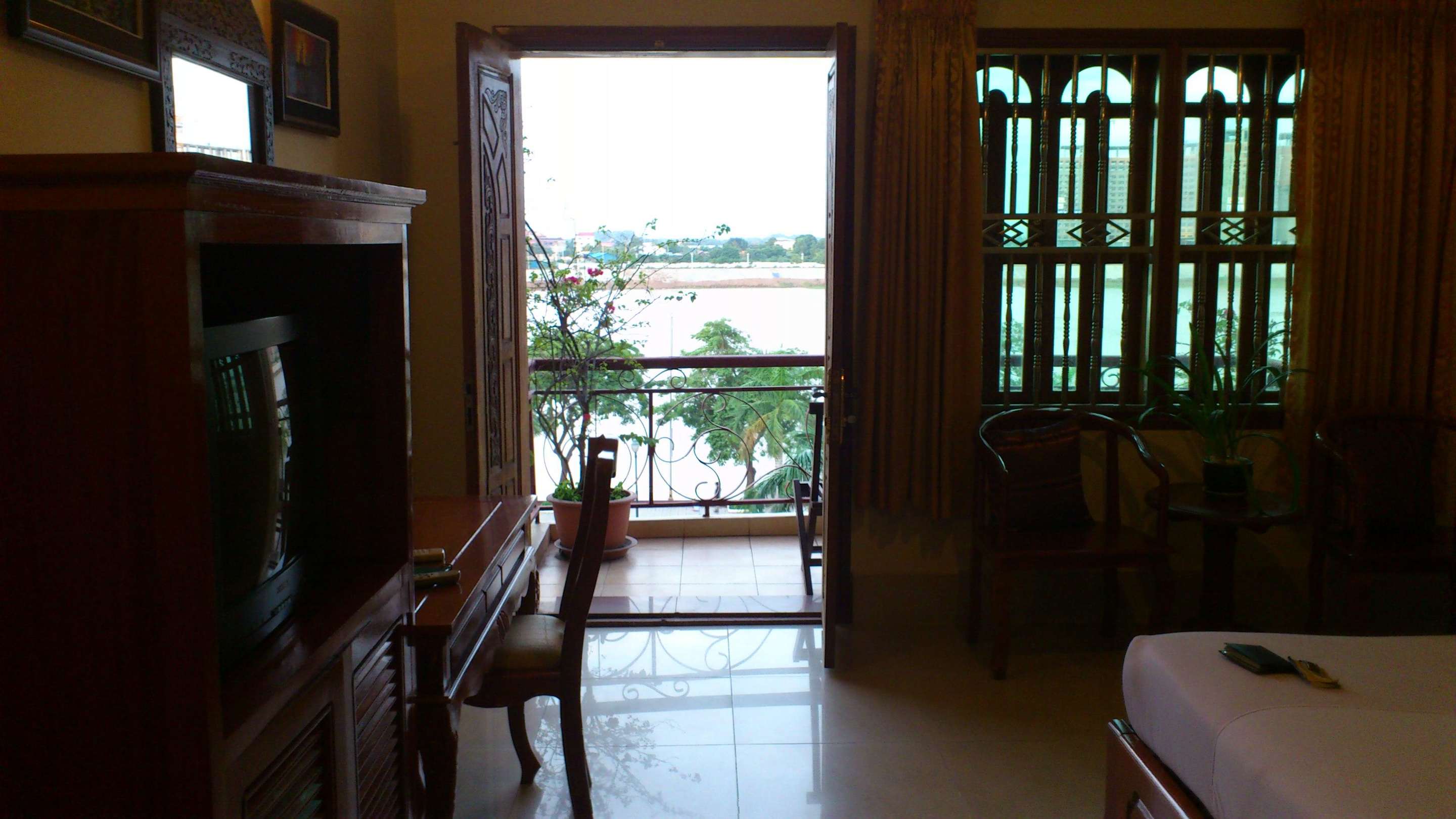 Blick vom Schlafbereich auf den Balkon/den Fluss