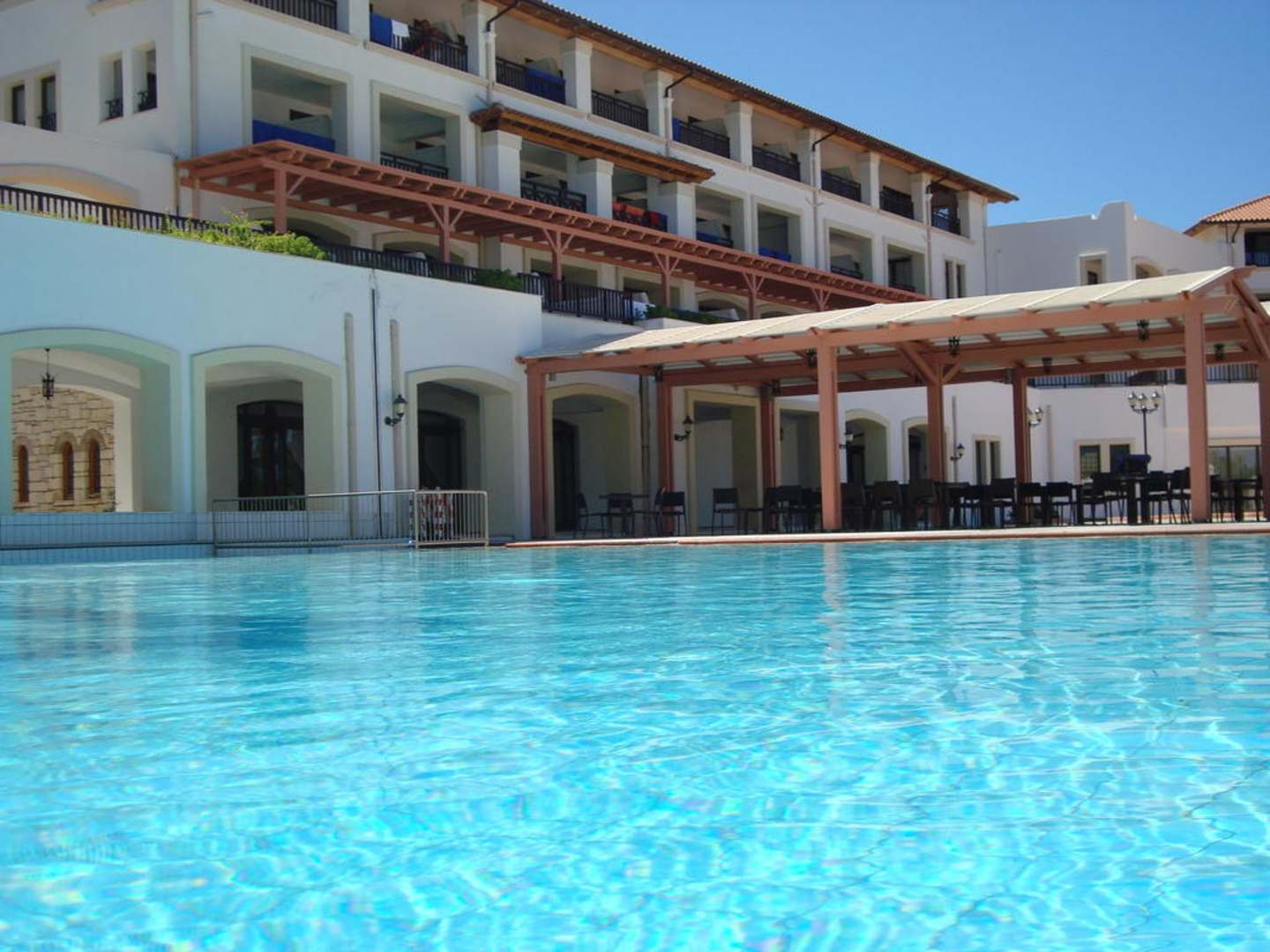widok z nad basenu na część hotelową