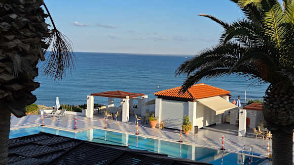 Blick auf Pool und PoolBar, sowie Strand