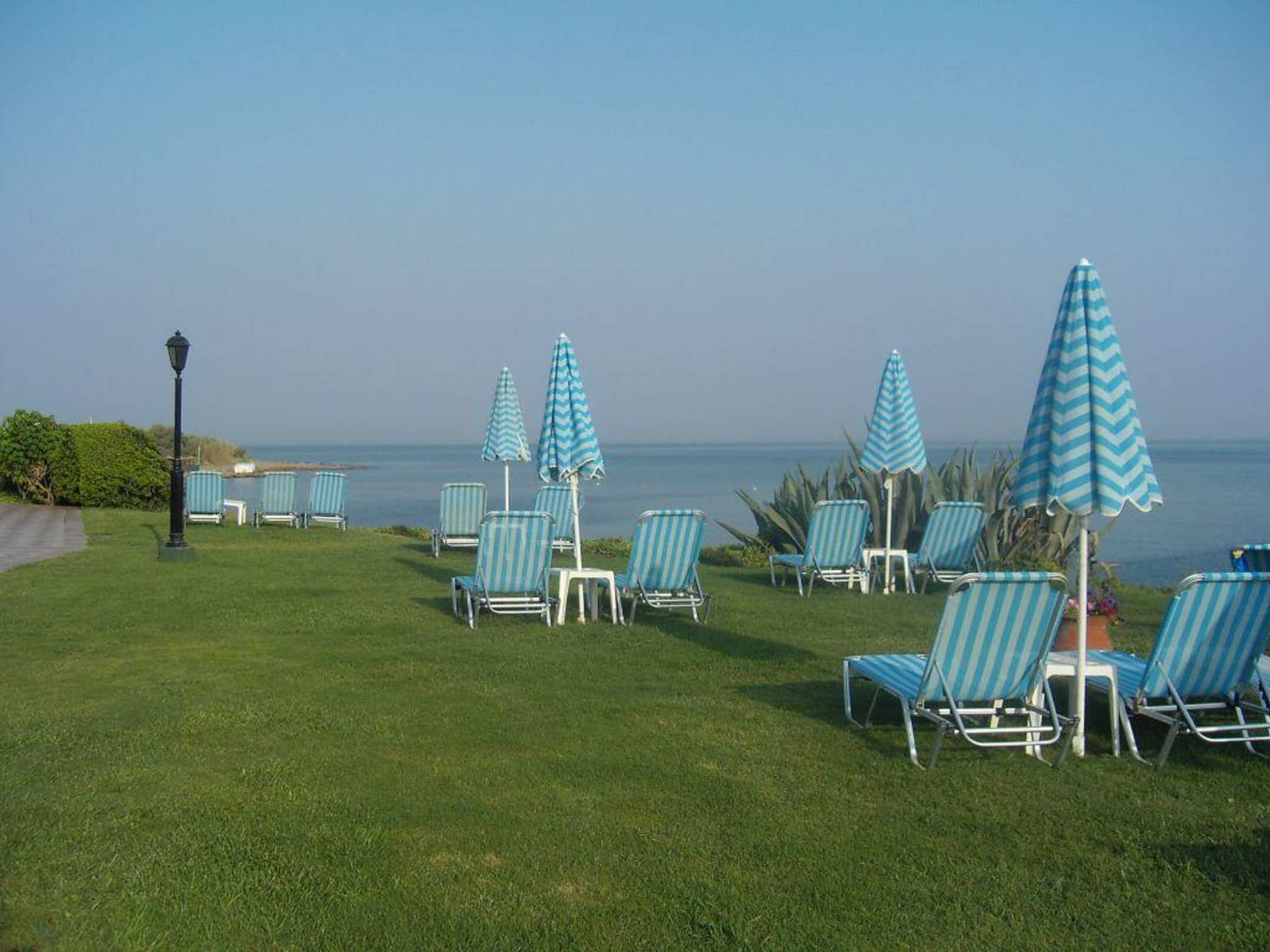 Die Hotel-Liegewiesen grenzen direkt an den Sandstrand, über kurze Treppe erreichbar.