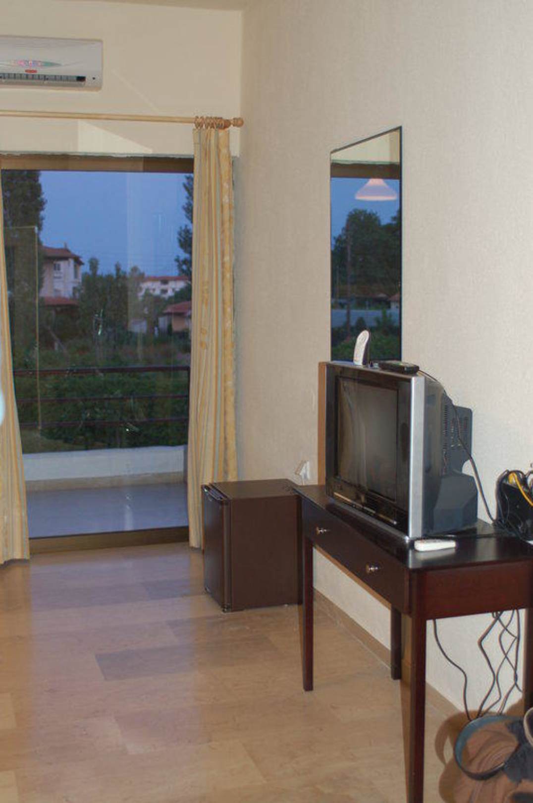 Im Bungalow: Fernsehtisch gegenüber des Doppelbettes