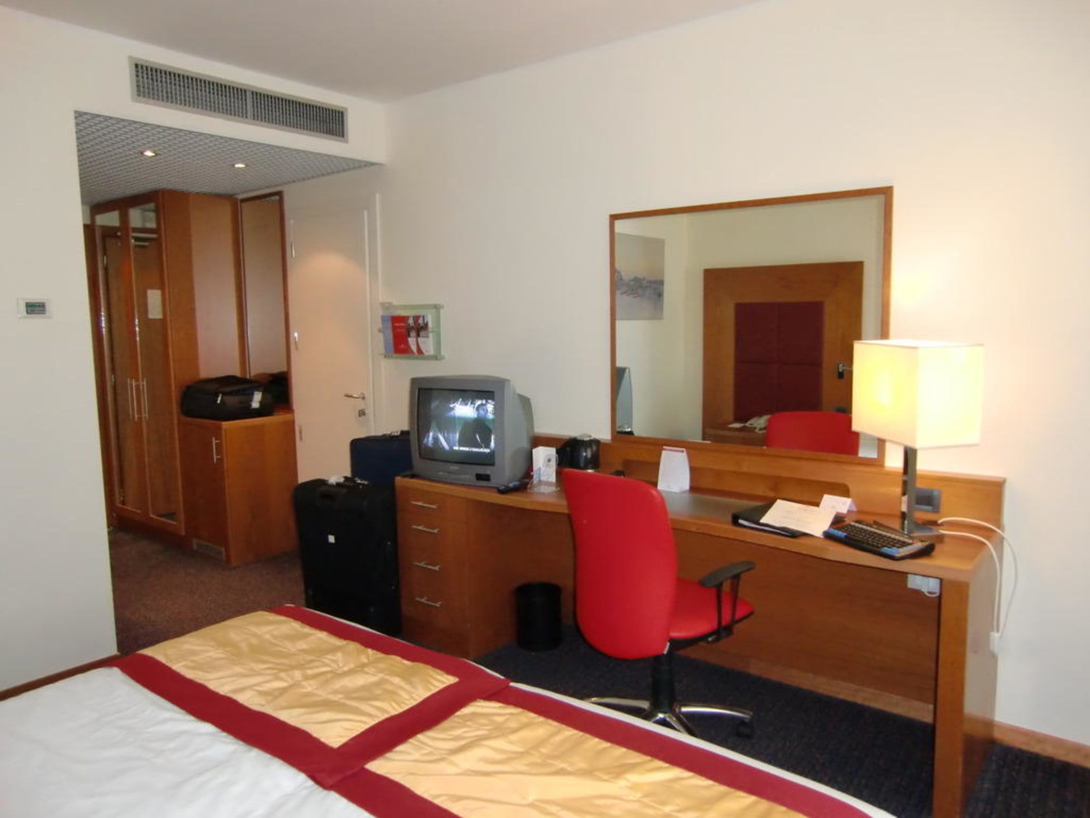 Schreibtisch mit TV und Kaffeemaschine
