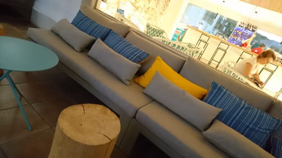 Café-Terrasse draußen mit Blick auf die Bar