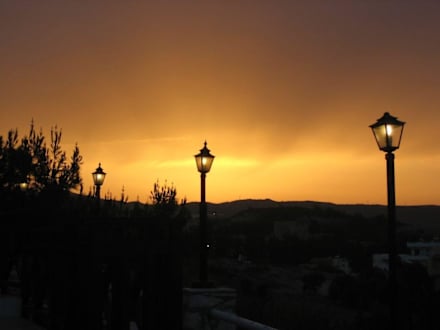 Sonnenuntergangwunderschöner Ausblick von der Restaurant-Terrasse