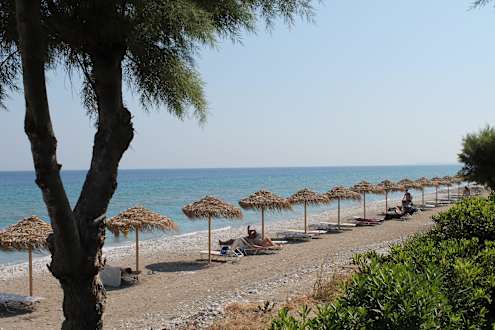 Strand mit Liege und Sonneschirme
