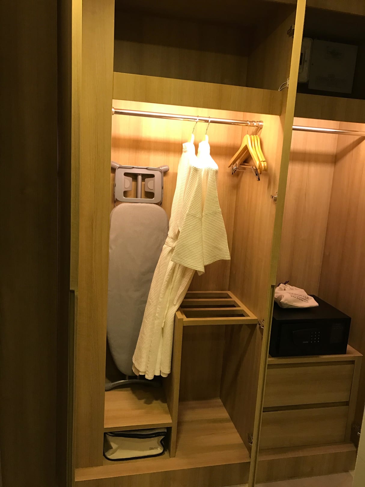 Gaderobe mit Bügelbrett, Bügeleisen, Bademäntel