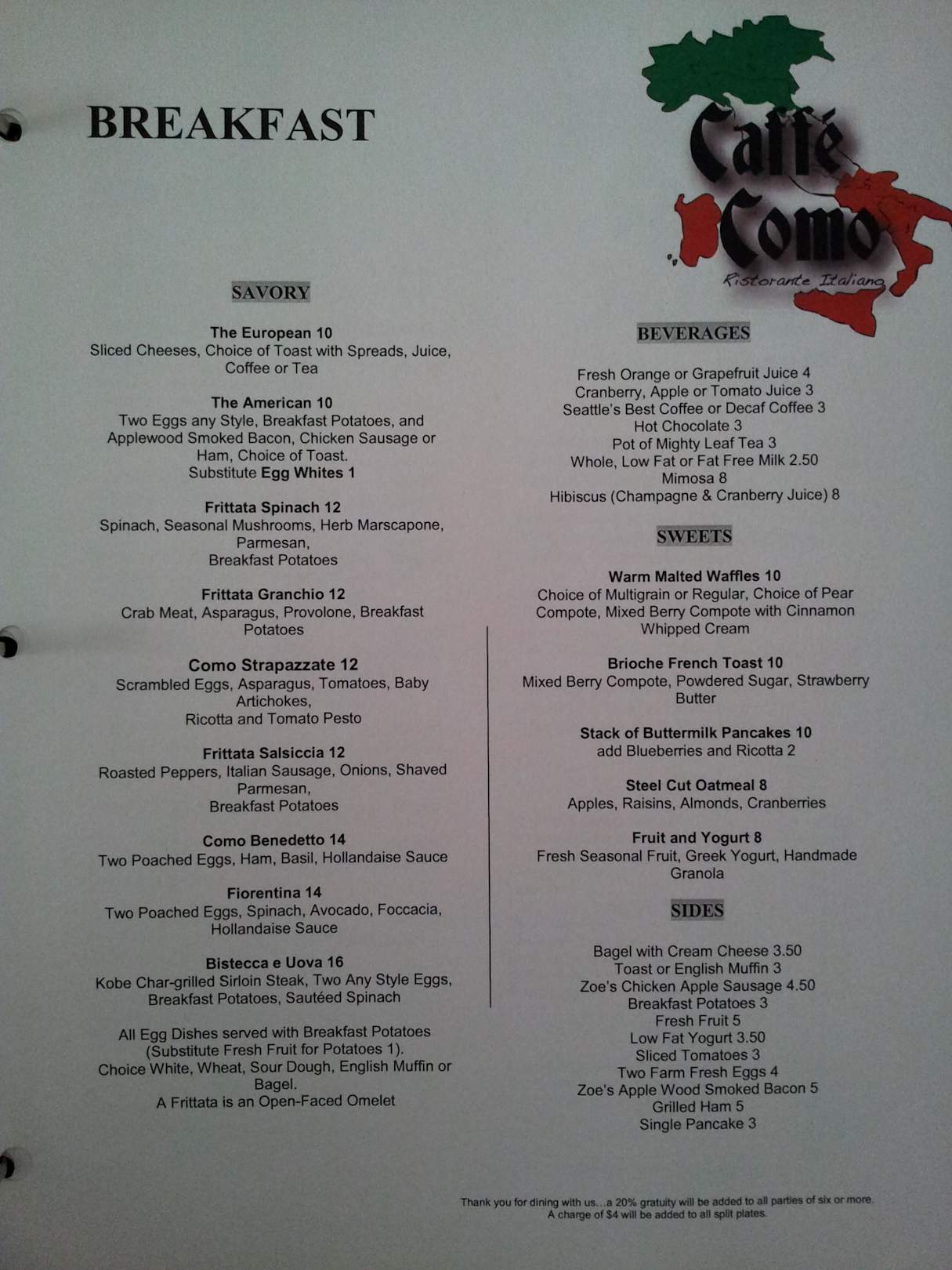 Frühstückskarte mit Preisen