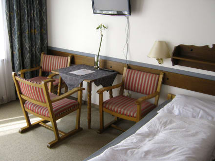 Sitzecke mit 3 Stühlen und einem Tisch. Außerdem mit dem Zustellbett.