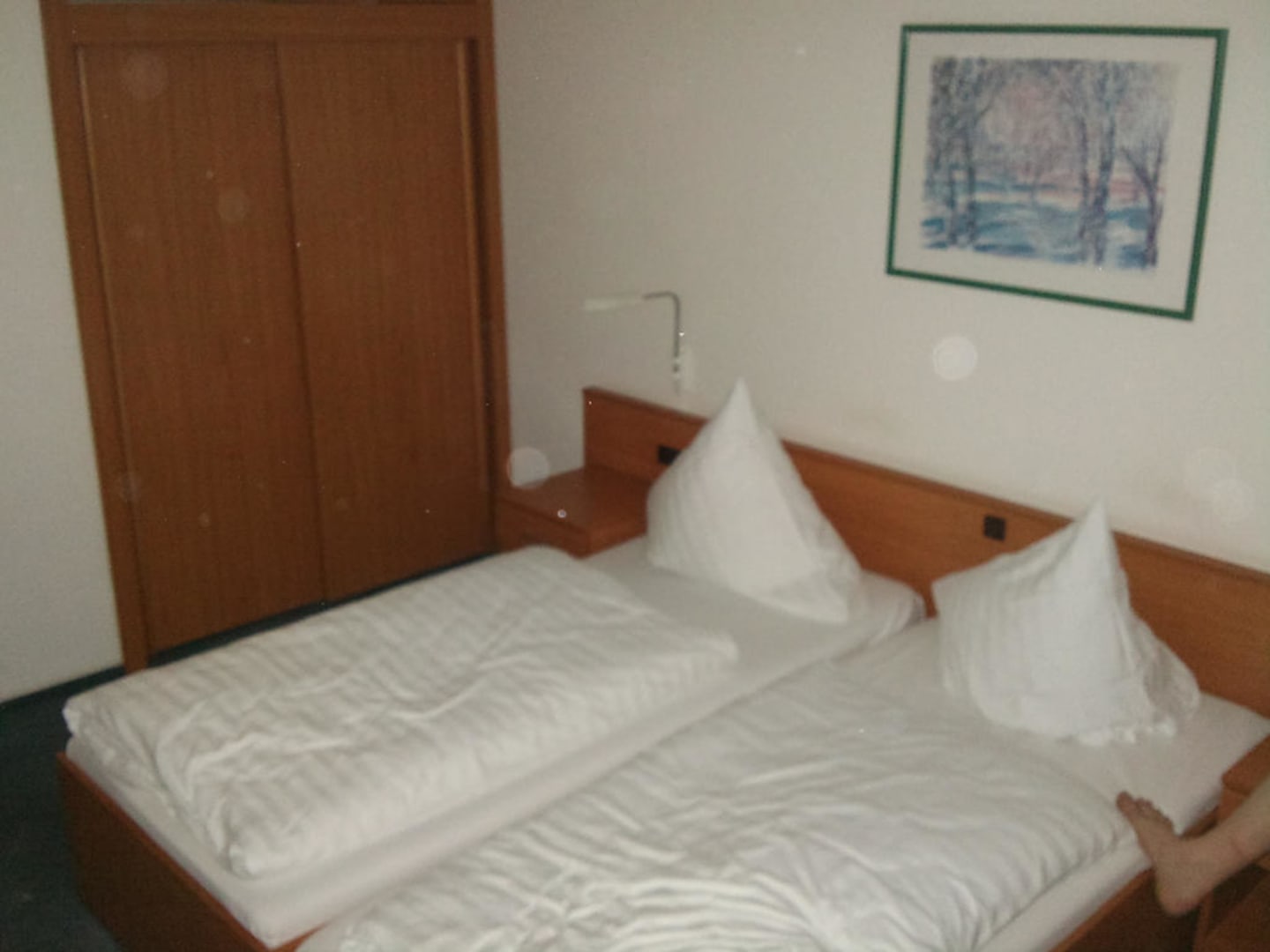 Zimmer mit Doppelbett und Wandschrank
