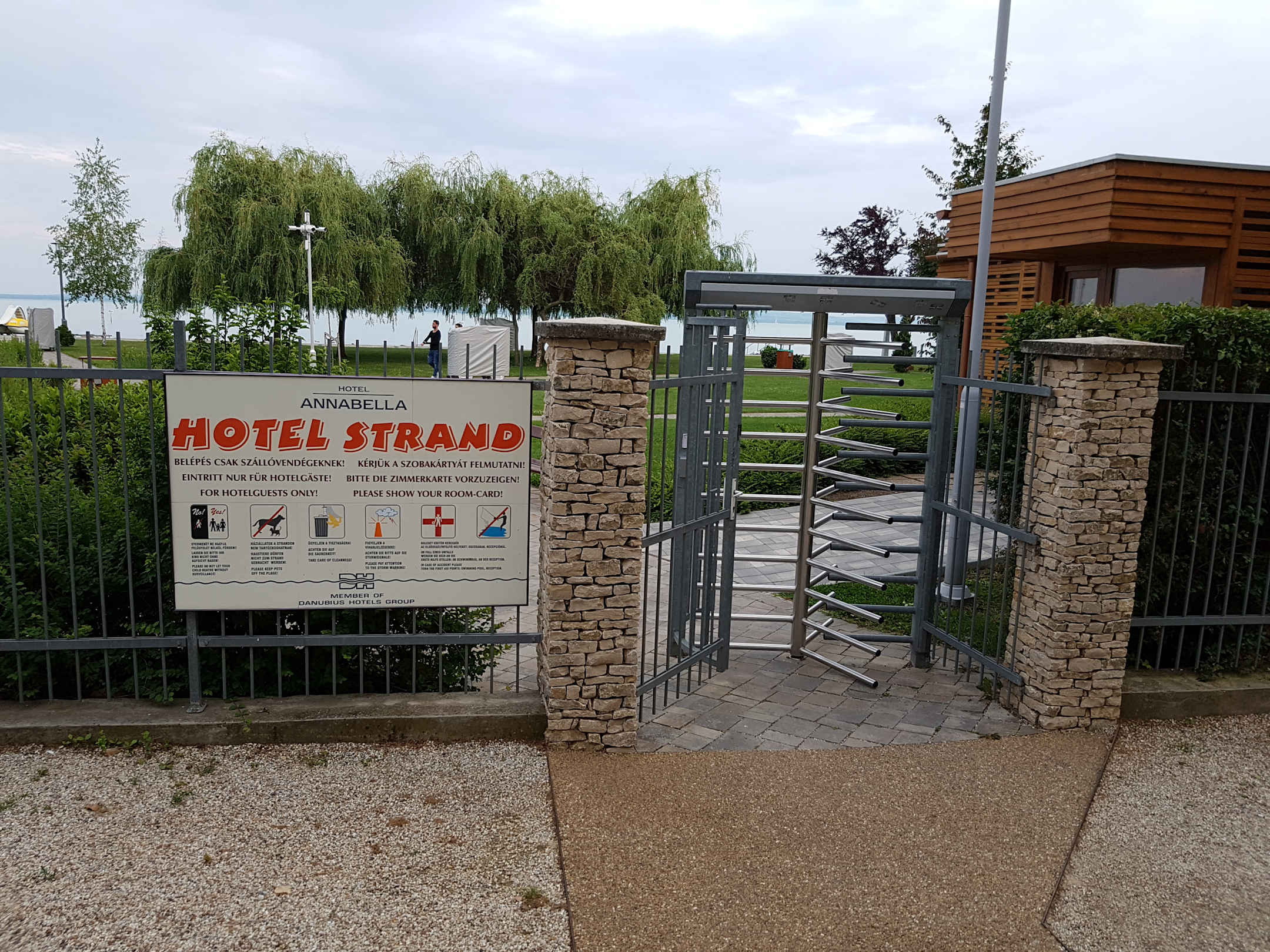 StrandHotel-"Strand" mit Liegewiese. Nur für Hotelgäste. Bei diesen Restaurants kann "auf´s Zimmer" bezahlt werden.