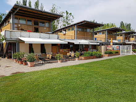 Hotel-"Strand" mit Liegewiese. Nur für Hotelgäste. Hier : Restaurant im Bereich