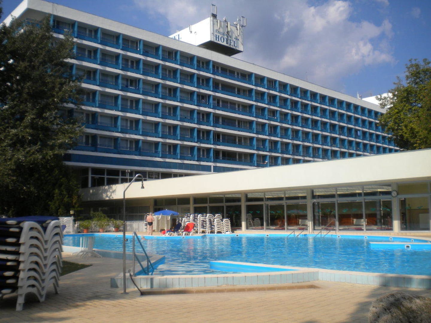 Vom Pool Richtung Hotel Das Bild zeigt den Pool mit Hallenbad sowie Außenanlage. Im 5. Stock , 4 Z von links war unser