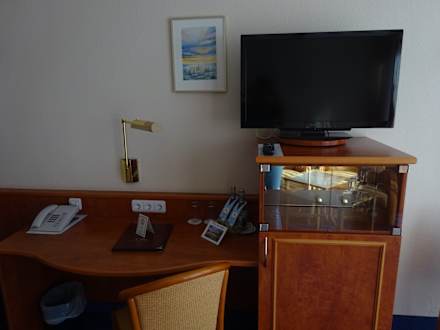 Schreibtisch mit Ferneher und Kühlschrank