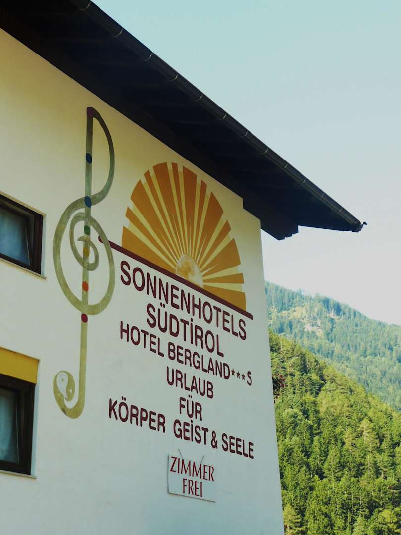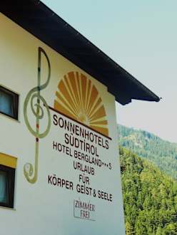 Logo mit Blickseite JaufenpassWenn man vom Jaufenpass kommt sieht man diese Bildseite des Bergland Hotels.