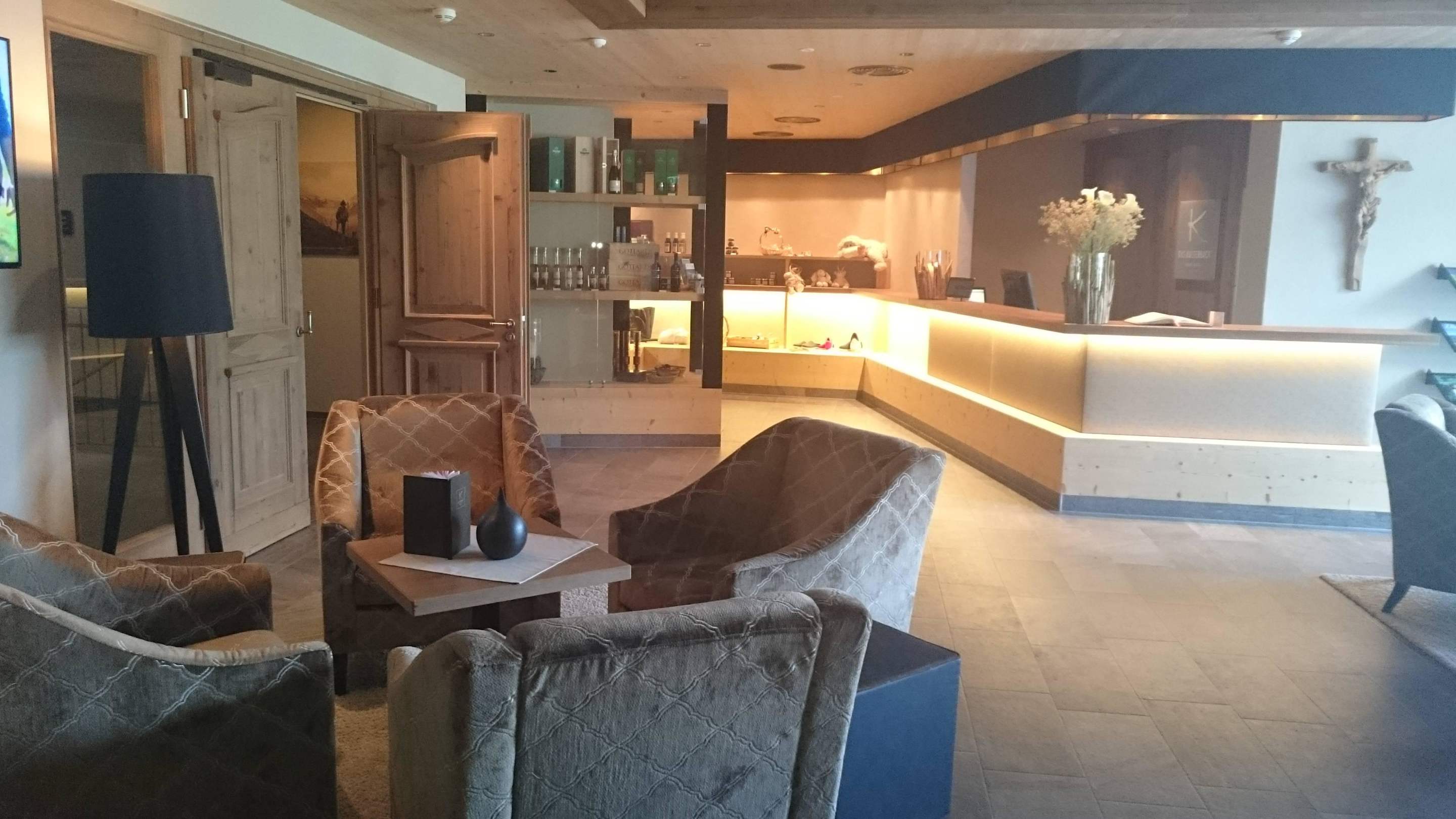 Rezeption, kleiner Shopbereich und Barsitzbereich